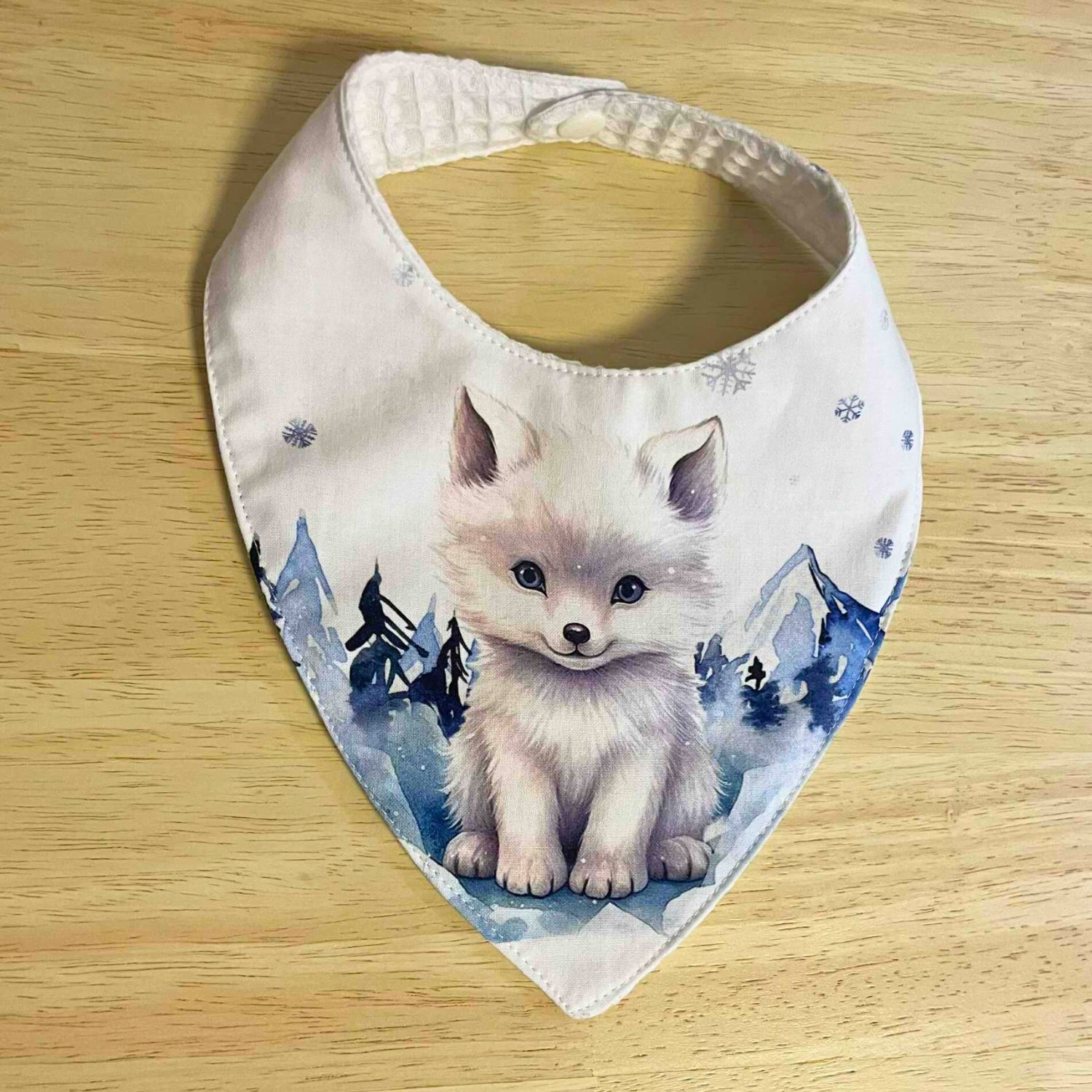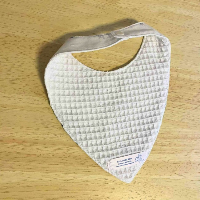 Devant du bavoir en coton imprimé "Louveteau", dos du bavoir en nid d'abeille blanc ou écru selon les stocks.